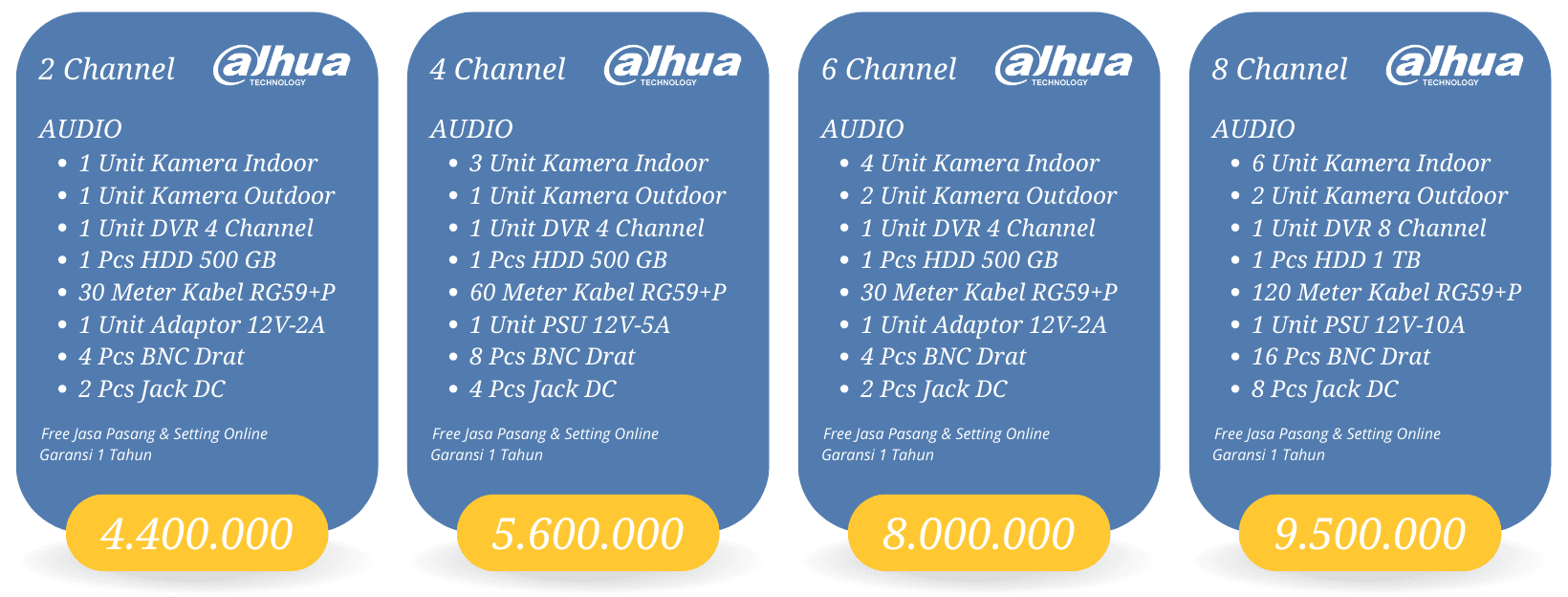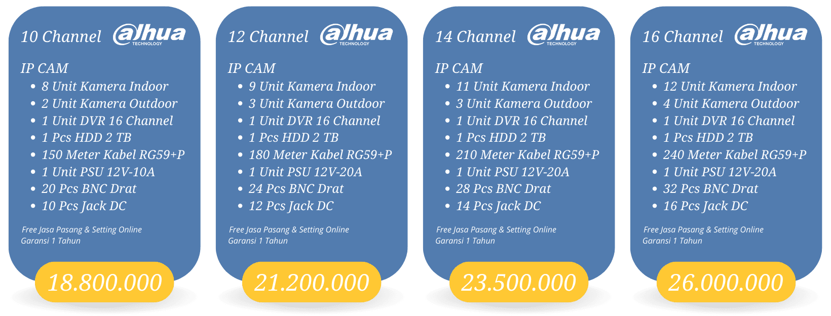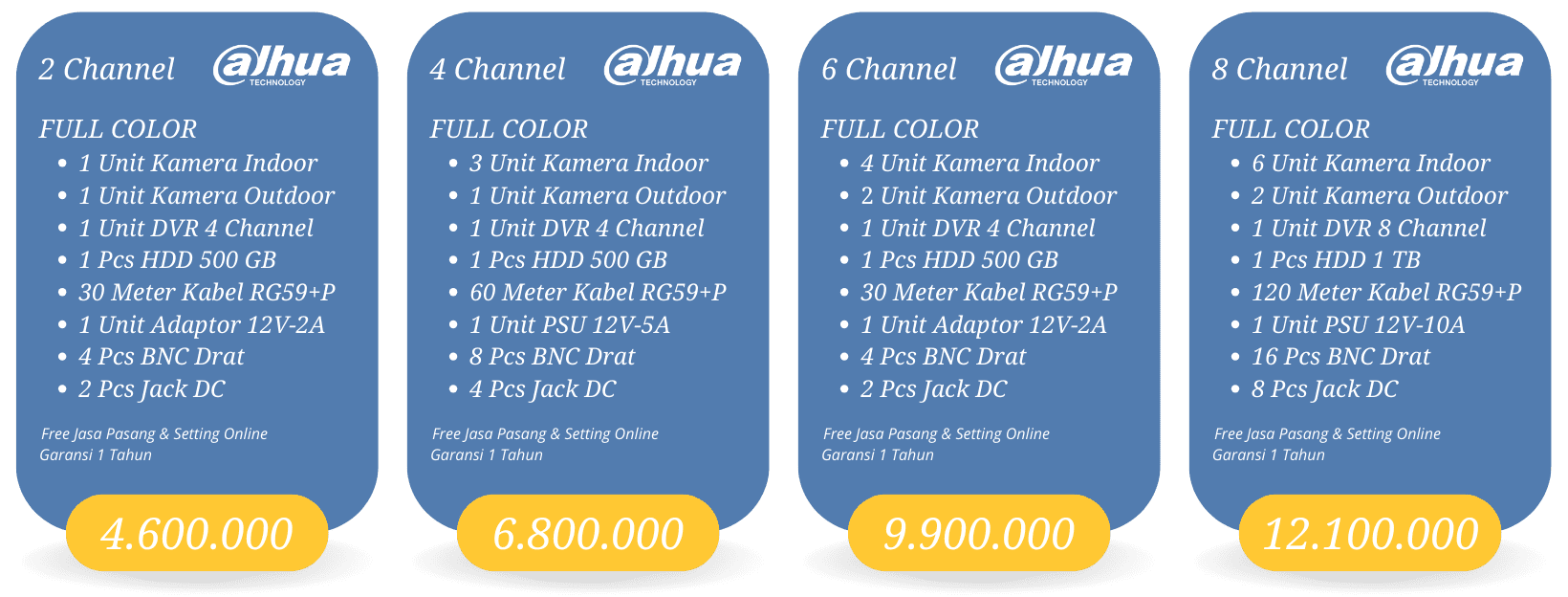 Dapatkan diskon hingga 20% maksimal 1.000.000 setiap pemasangan paket CCTV Dahua 4 – 16 Channel, tanpa syarat dan ketentuan. Free jasa pemasangan, setting online, & bergaransi 1 tahun.