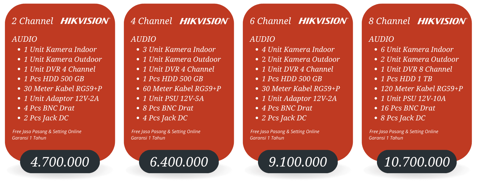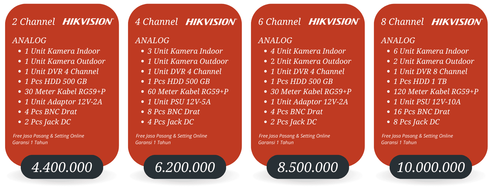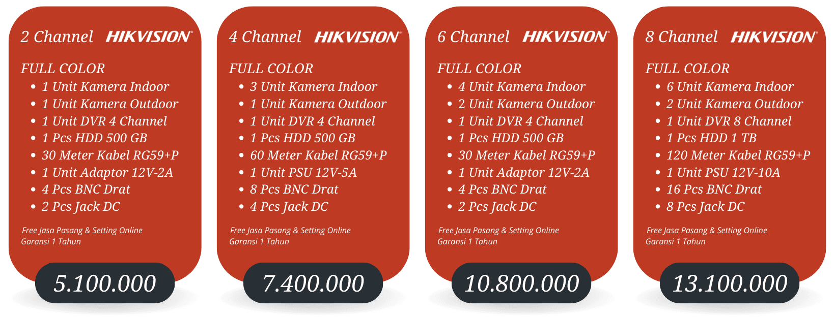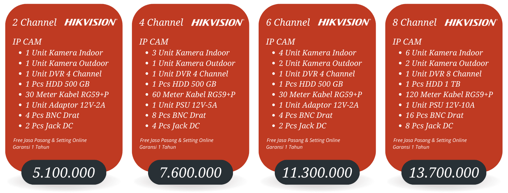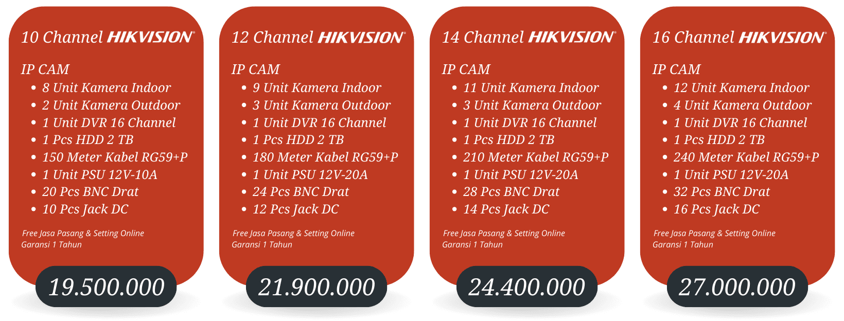 Dapatkan diskon hingga 20% maksimal 1.000.000 setiap pemasangan paket CCTV Hikvision 4 – 16 Channel, tanpa syarat dan ketentuan. Free jasa pemasangan, setting online, & bergaransi 1 tahun.
