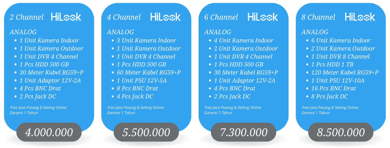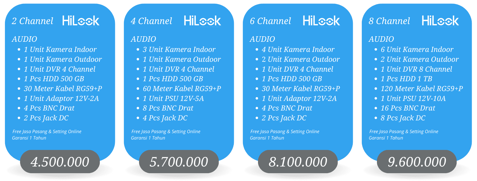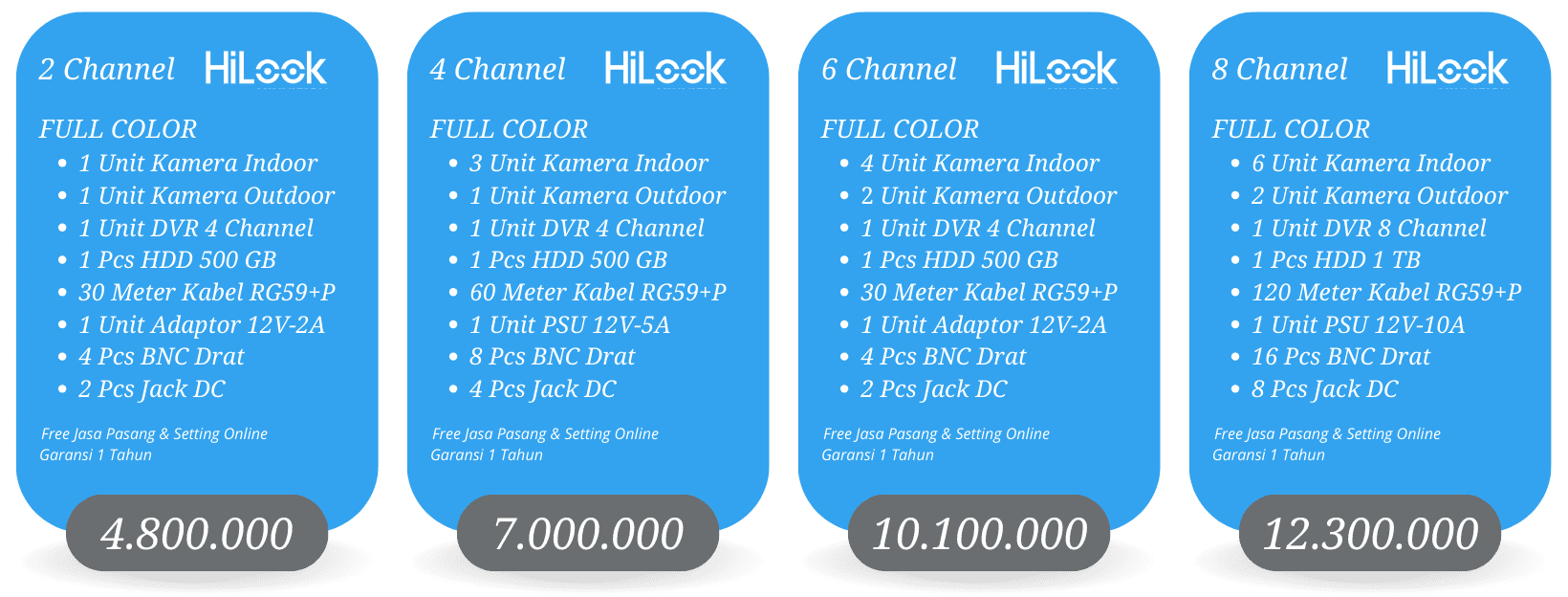 Dapatkan diskon hingga 20% maksimal 1.000.000 setiap pemasangan paket CCTV HiLook 4 – 16 Channel, tanpa syarat dan ketentuan. Free jasa pemasangan, setting online, & bergaransi 1 tahun.